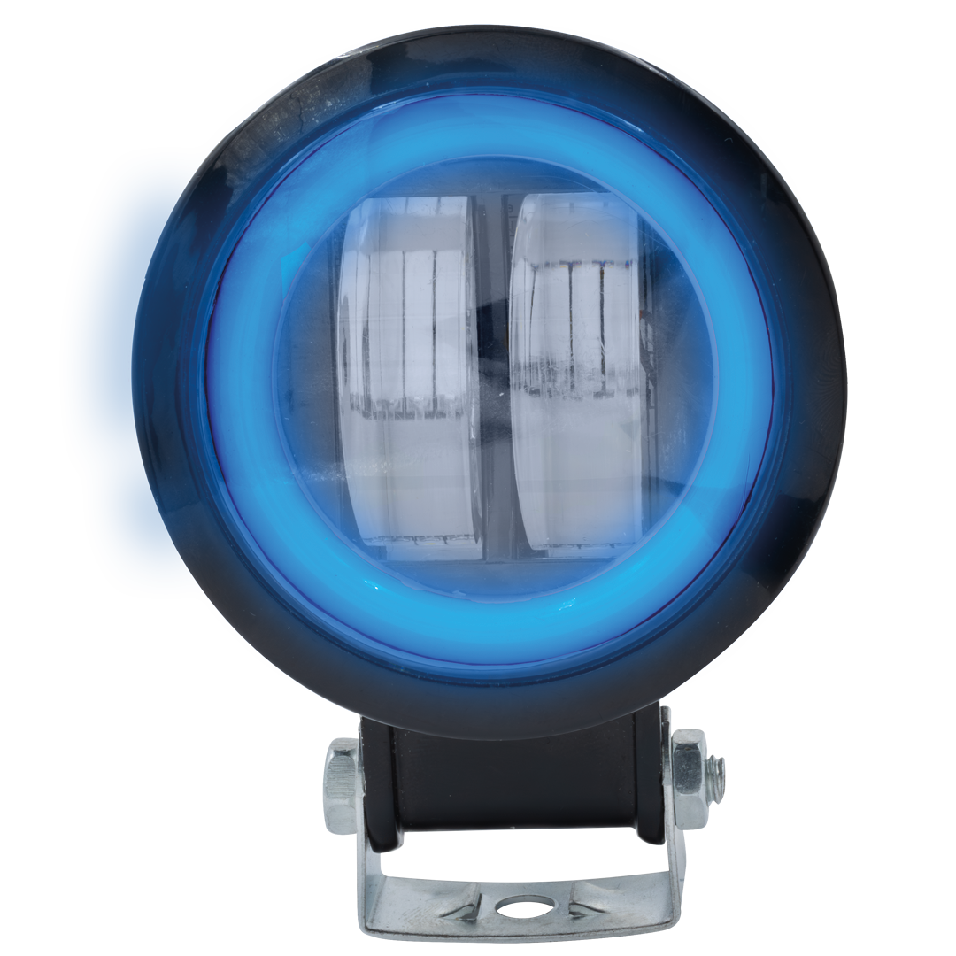 FARO PARA MOTOCICLETA, LENTE OPTICO, LUZ BLANCA ALTA / BAJA, ARO DE LUZ AZUL C/ESTROBO, 12V